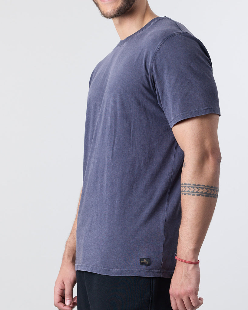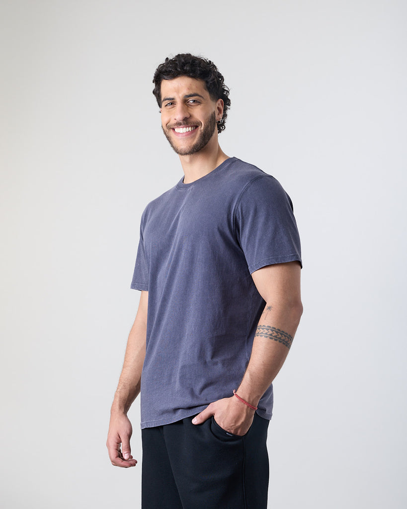 Polera manga corta hombre confeccionada con 100% algodón en tela procesada. Cuello redondo clásico y calce Modern Fit la convierten en una elección ideal tanto para la ciudad como para una salida casual. El calce Modern Fit es un corte más holgado, con una silueta suelta y relajada, pero no oversize.