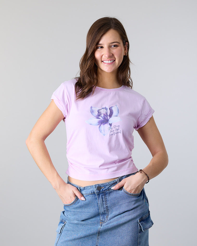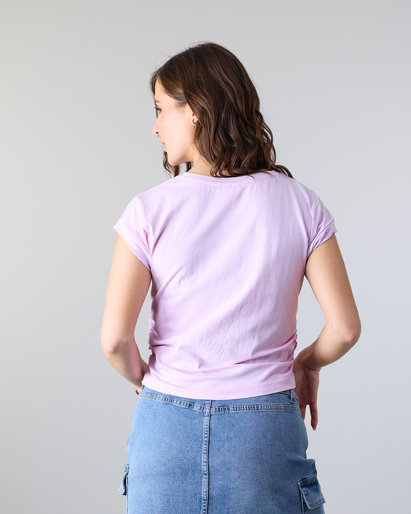Polera mujer ideal para disfrutar este verano con un estilo slow fashion, fabricada con materiales de alta calidad y un enfoque en la durabilidad. Esta polera con print localizado se convierte en un básico de tu oufit