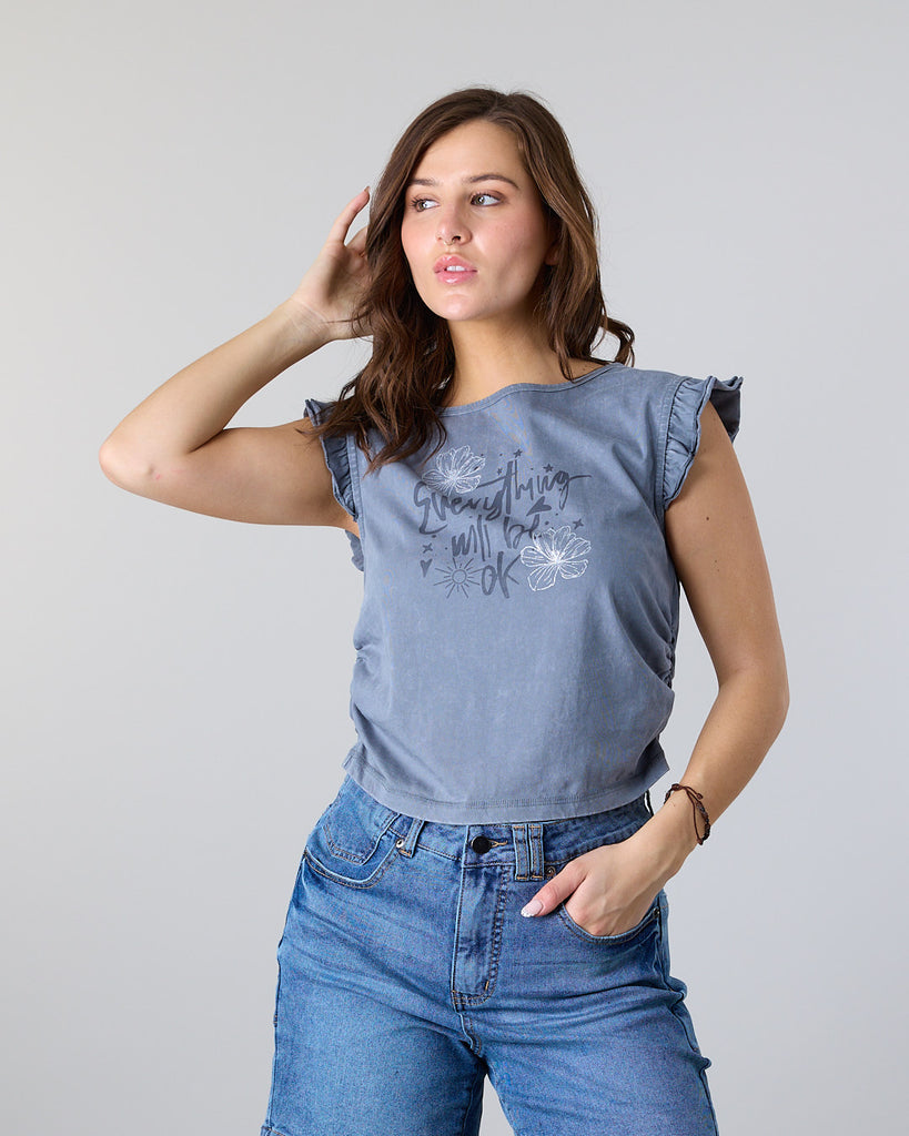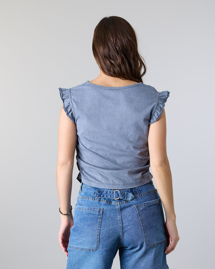 Polera mujer ideal para disfrutar este verano con un estilo slow fashion, fabricada con materiales de alta calidad y un enfoque en la durabilidad. Esta polera con vuelos en las mangas y estampado print Glitter se convierte en un esencial de tu oufit