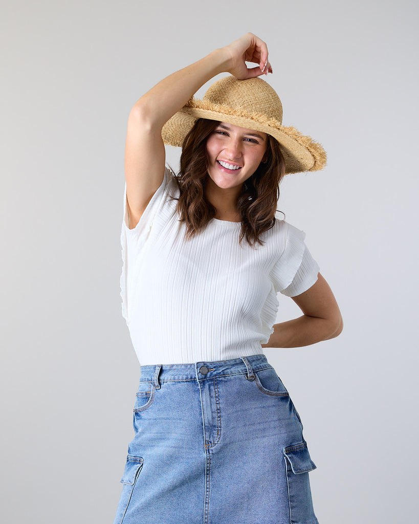 Polera mujer ideal para disfrutar este verano con un estilo slow fashion, fabricada con materiales de alta calidad y un enfoque en la durabilidad. Esta polera en color sólido y manga con vuelos se convierte en un básico de tu oufit