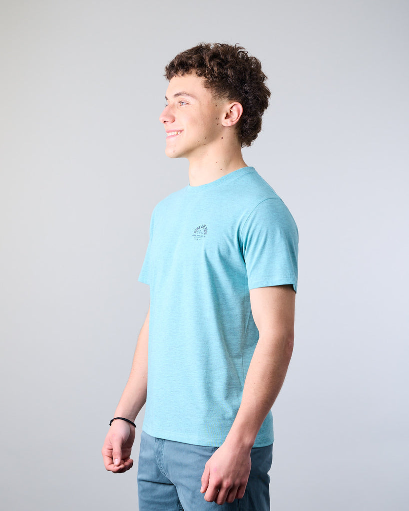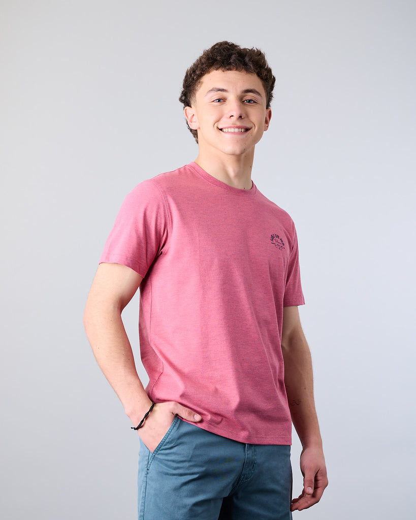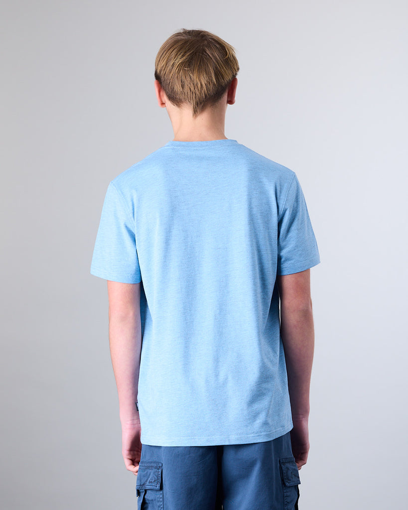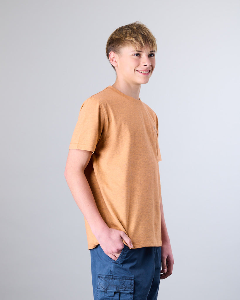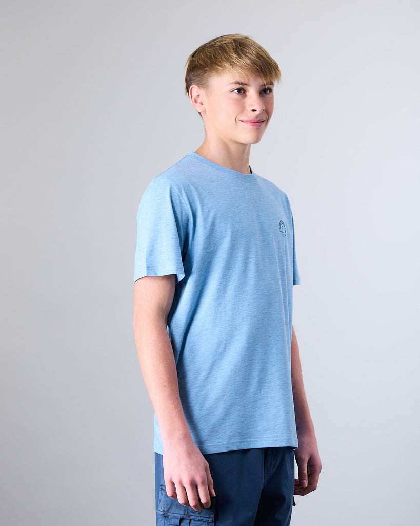 Polera manga corta Junior confeccionada con 60% algodón y 40% poliester, en color Melange. El cuello redondo clásico y calce Modern Fit la convierten en una elección ideal tanto para la ciudad como para una salida casual. El calce Modern Fit es el punto medio entre Slim Fit y corte Recto, entrega más comodidad y libertad de movimiento.